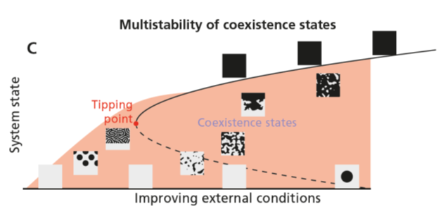 Figure 1C. Multi-stability of coexistence states. Evasion of tipping can also be due to multi-stability of coexistence states. Following disturbance (e.g. grazing, fire), the spatial system allows for mosaics of alternative stable states in space, known as coexistence states, thereby evading tipping of the complete, wide-ranging ecosystem. These spatial patterns originate in the region of alternative stable states before the tipping point; the evolving spatial patterns can also persist beyond the tipping point with worsening environmental conditions, thereby constituting an alternative pathway evading tipping points (Rietkerk et al 2021).