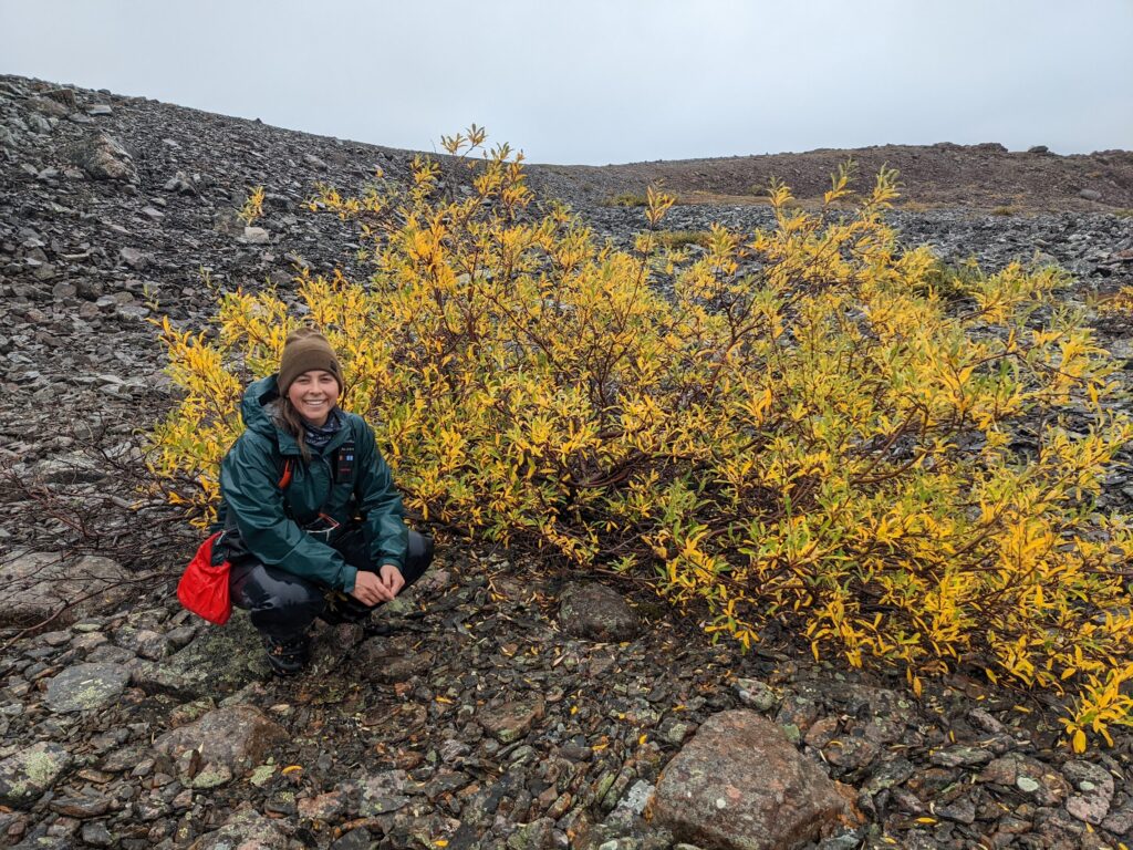 Figure 18. New PhD student Bailey Bingham with a surprisingly large willow shrub during previous work in Nunavut, Canada. This willow is growing in a particularly warm and wet lowlaying area.