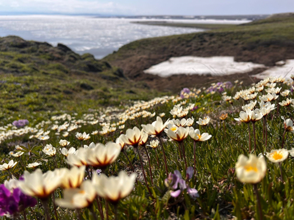 Figure 1. A meadow of flowering Dryas integrifolia, one of the iconic vegetation species that makes up the diverse ecosystem on Qikiqtaruk. (credit: Ciara Norton)