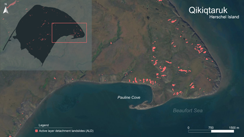 Figure 6. A map of over 700 active layer detachment landslides that formed due to a three-week heat wave of extreme temperatures thawing the ice-rich permafrost below. (credit: Ciara Norton)