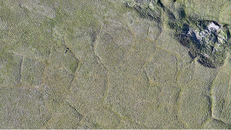 Figure 12. Can you find us in this photo? Much like in this photo, ice wedge polygons are widespread across Qikiqtaruk. They are much easier to see from drone imagery than from the ground due to their size. (credit: Myriam Cloutier)