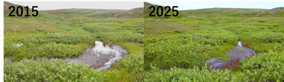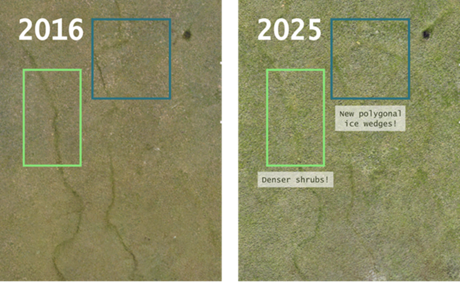 Within only a decade, we are able to see changes related to permafrost thaw, specifically newly visible ice wedges, and vegetation composition through shrubification and increased plant growth. See for yourself in these images from 2016 and 2025!