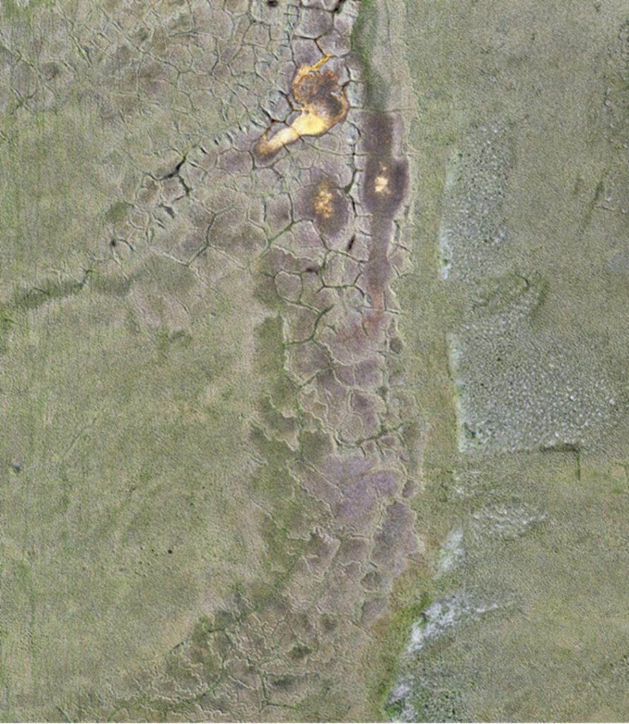 Figure 14. This is a site on the Yukon North Slope characterised by all sorts of patterns: ice wedge polygons of various sizes, frostboils to the right, and caribou tracks going up and down this site! (credit: Myriam Cloutier)
