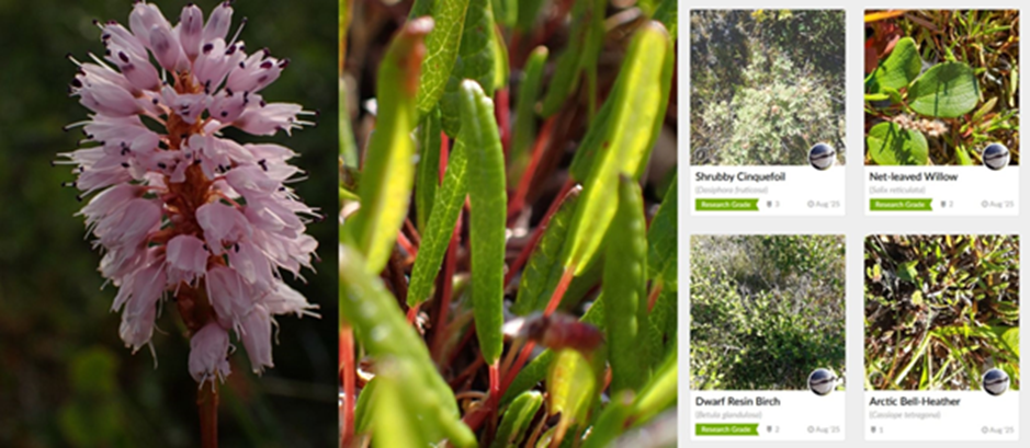 Figure 17. A Bistorta vivipara flower, Dryas integrifolia leaves and Jeremy’s list of iNaturalist observations. (credit: Jeremy)
