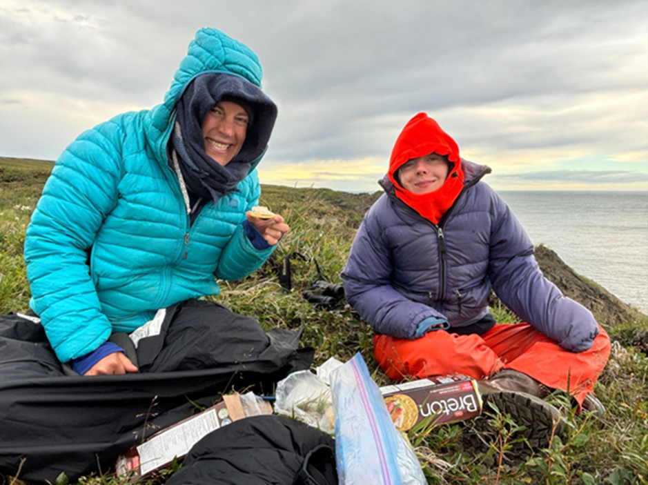 Figure 22. Isla and Ciara have a snack on a chilly day on the tundra. (credit: Cameron Eckert)